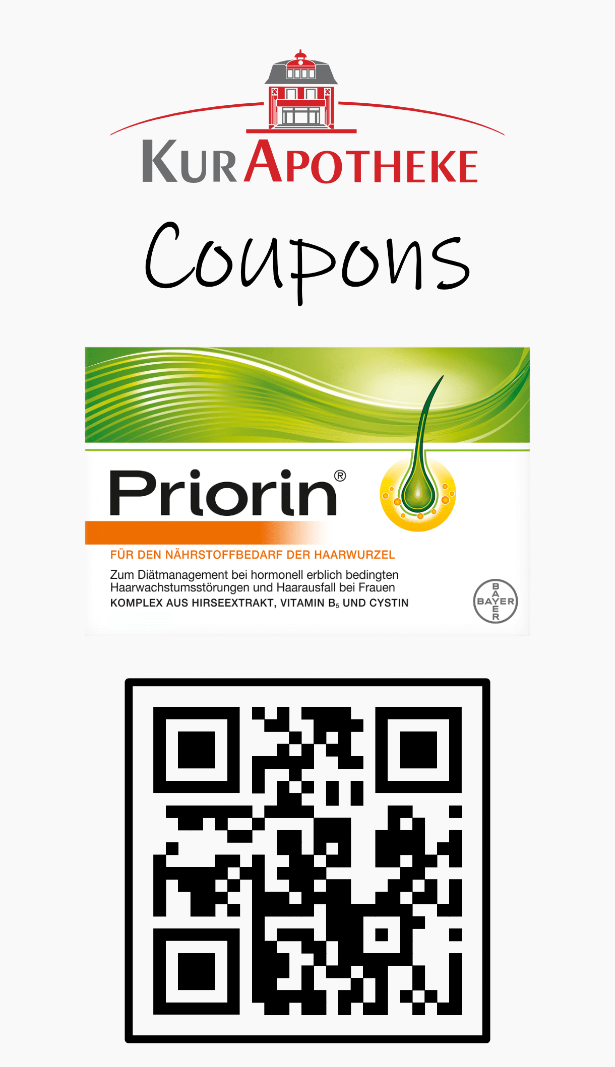 Gültig für alle Priorin® Kapsel Produkte sowie die Priorin® Haarmaske. Beim Kauf von Priorin® Kapseln Packungsgröße 30 St. erhalten Sie 5 € Sofortrabatt, bei Packungsgröße 120 St. erhalten Sie 10 € Sofortrabatt und bei Packungsgröße 270 St. erhalten Sie 15 € Sofortrabatt. Der Rabatt wird beim Einkauf automatisch an der Kasse abgezogen. Nicht mit anderen Aktionen kombinierbar. Vervielfältigungen werden nicht akzeptiert. Eine Barauszahlung erfolgt nicht. Nur in teilnehmenden Apotheken innerhalb Deutschlands.