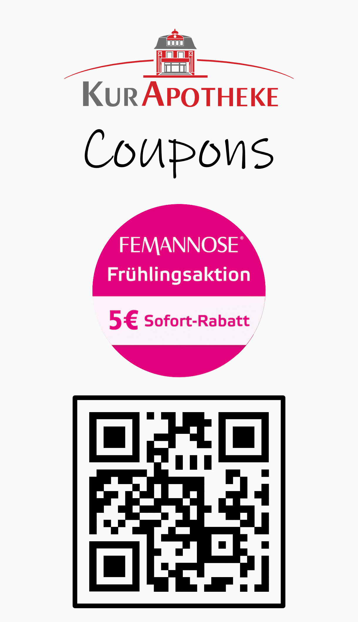 Beim Kauf eines Produkts der Marke FEMANNOSE® erhalten Sie ab einem Wert von 20 € gegen Vorlage des Coupons einen Rabatt in Höhe von 5 € direkt an der Kasse. Nur ein Coupon pro Kauf einlösbar. Nicht mit anderen Aktionen kombinierbar. Vervielfältigungen werden nicht akzeptiert. Eine Barauszahlung erfolgt nicht. Nur in teilnehmenden Apotheken innerhalb Deutschlands.